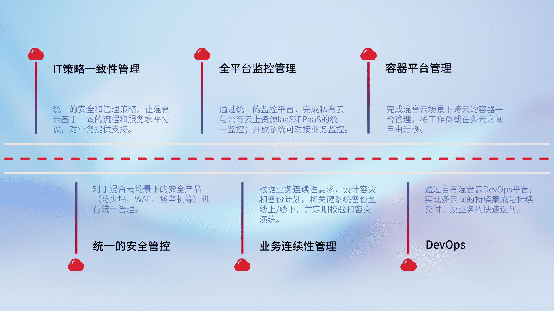 通过多云纳管,,,以统一的资源数据模型把客户的云资源进行抽象和封装,,进而实现对多云资源的统一操作,,,保障云资源管理的可靠性、、稳定性与可用性。。量身定制化运维内容,,,,配置、、、、开发运维、、、补丁管理、、备份、、、监控、、认证和访问管理、、审计和日常巡检等,,保障在用云过程中的可靠度,,稳定度以及高可用率。。。。